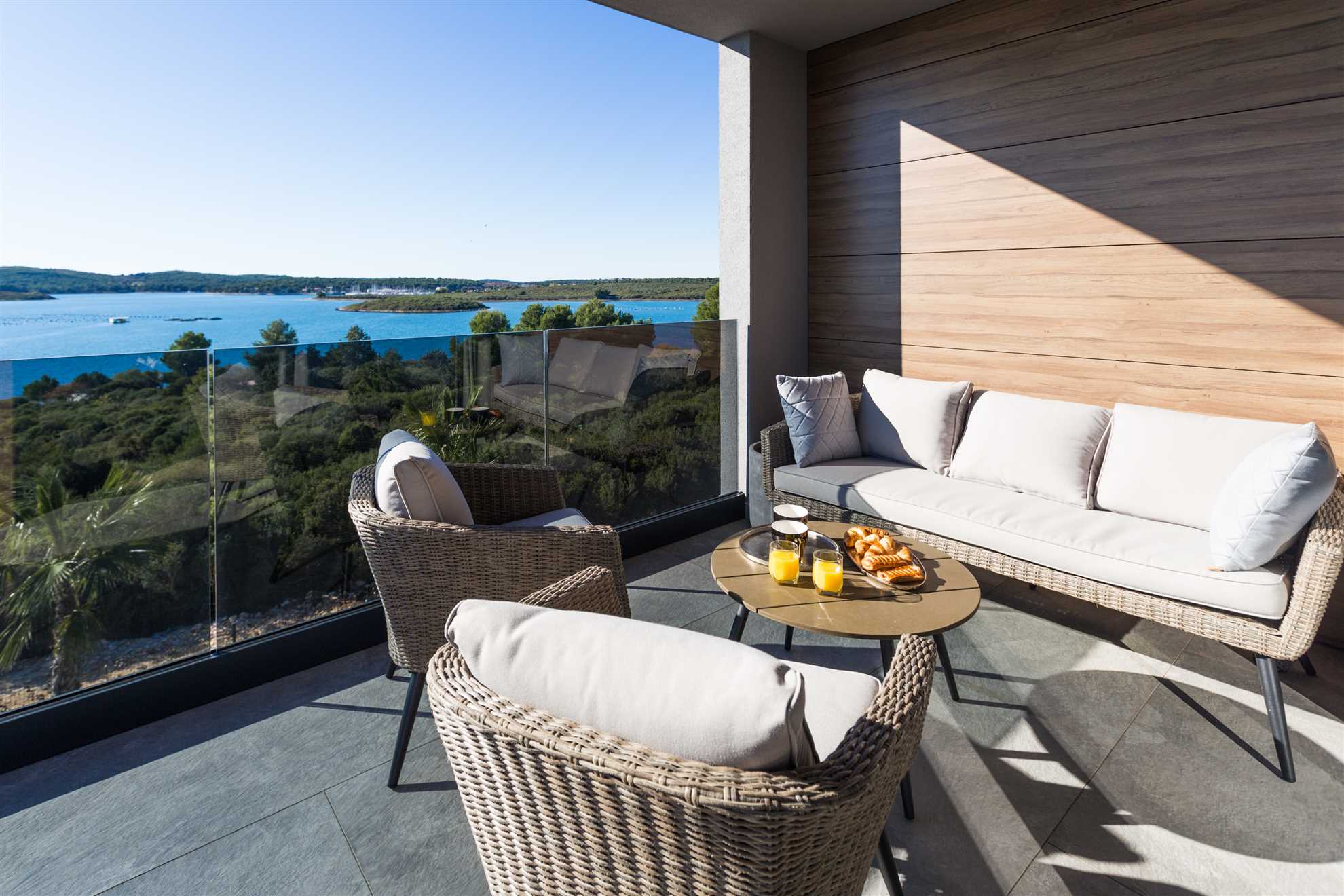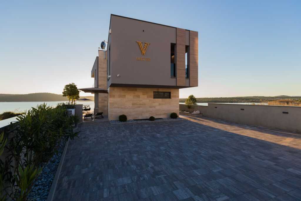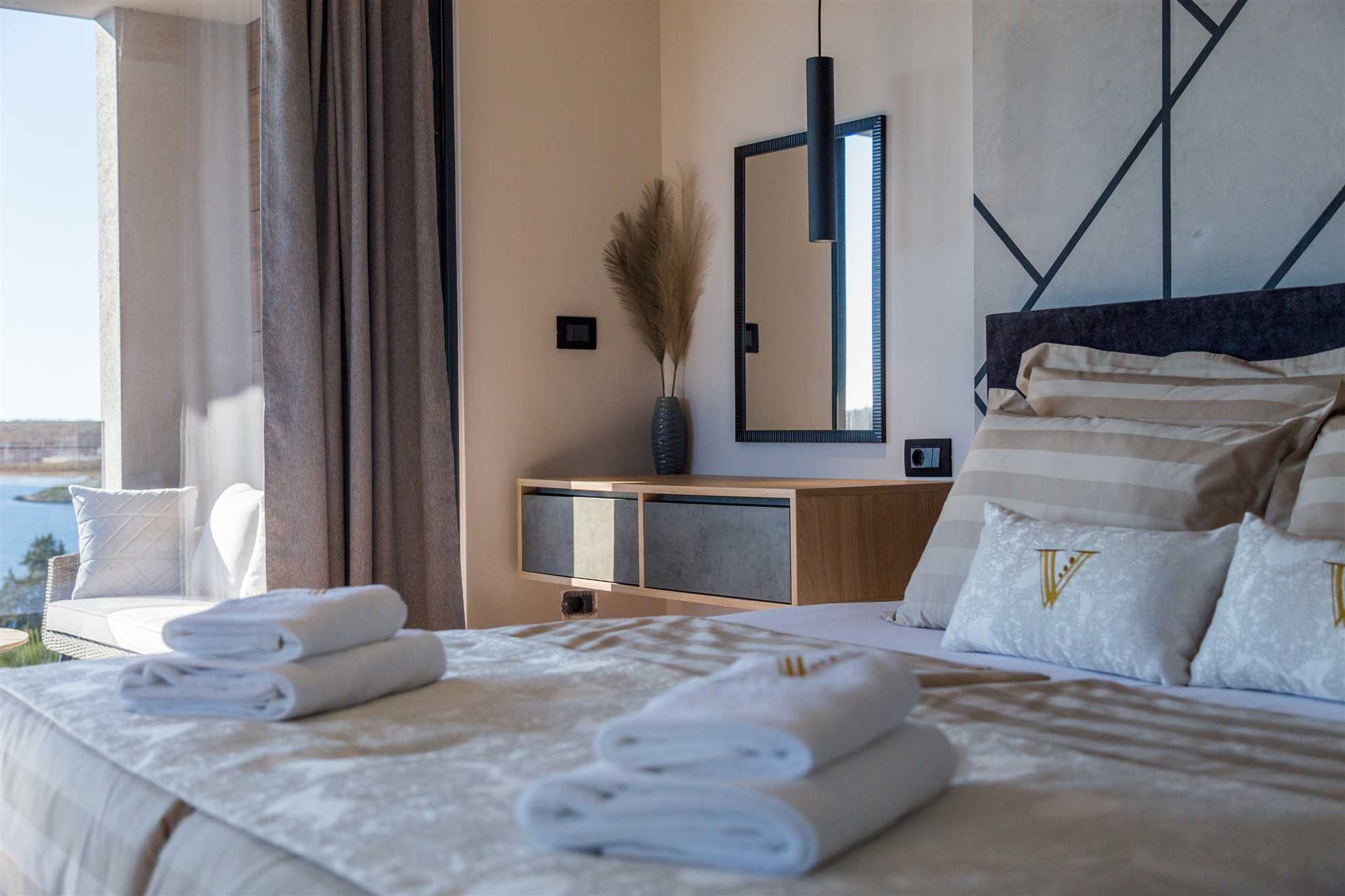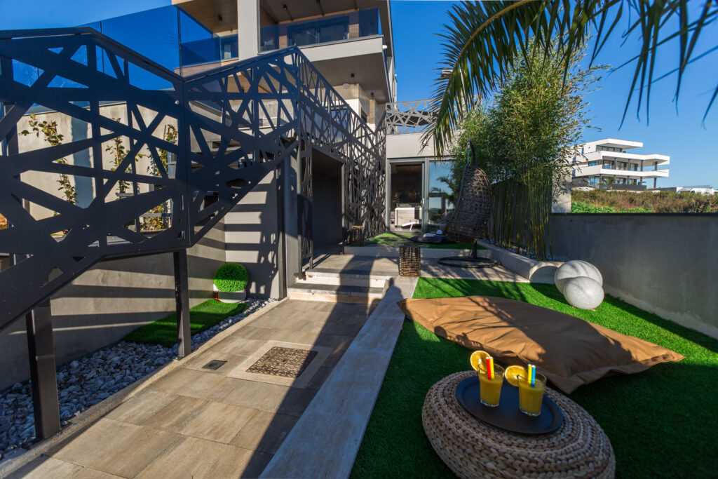 Elegant Accommodation Villa Vie offers 5 luxury bedrooms for up to 10 guests—one on the ground floor and four on the first. Some rooms feature private terraces with breathtaking sea views, perfect for a morning coffee. For ultimate indulgence, the master bedroom includes a bathtub by a panoramic window. Each room has a private bathroom, king-size bed, satellite TV, air conditioning, and premium amenities. A crib is available upon request.