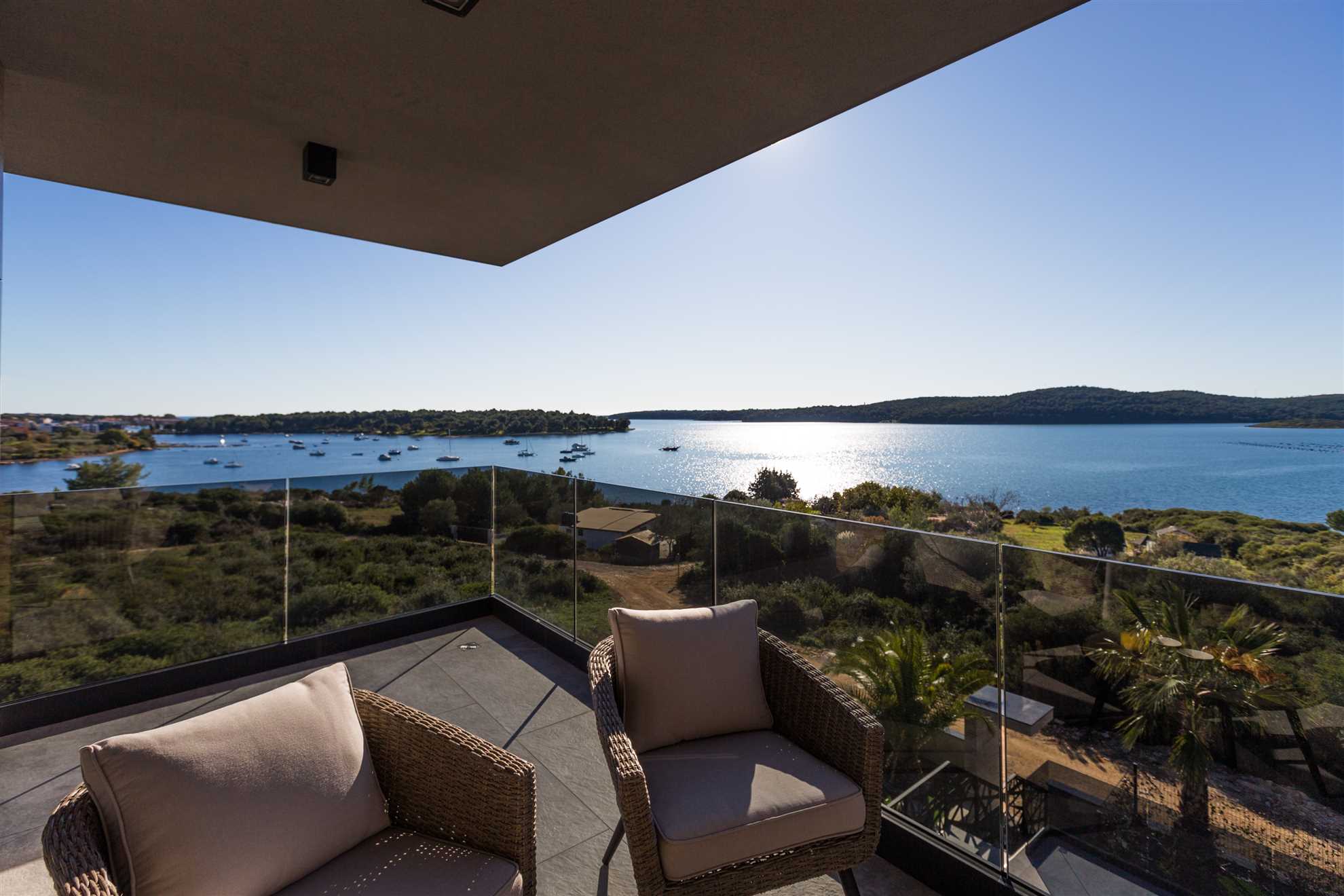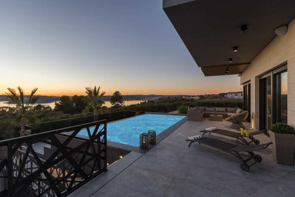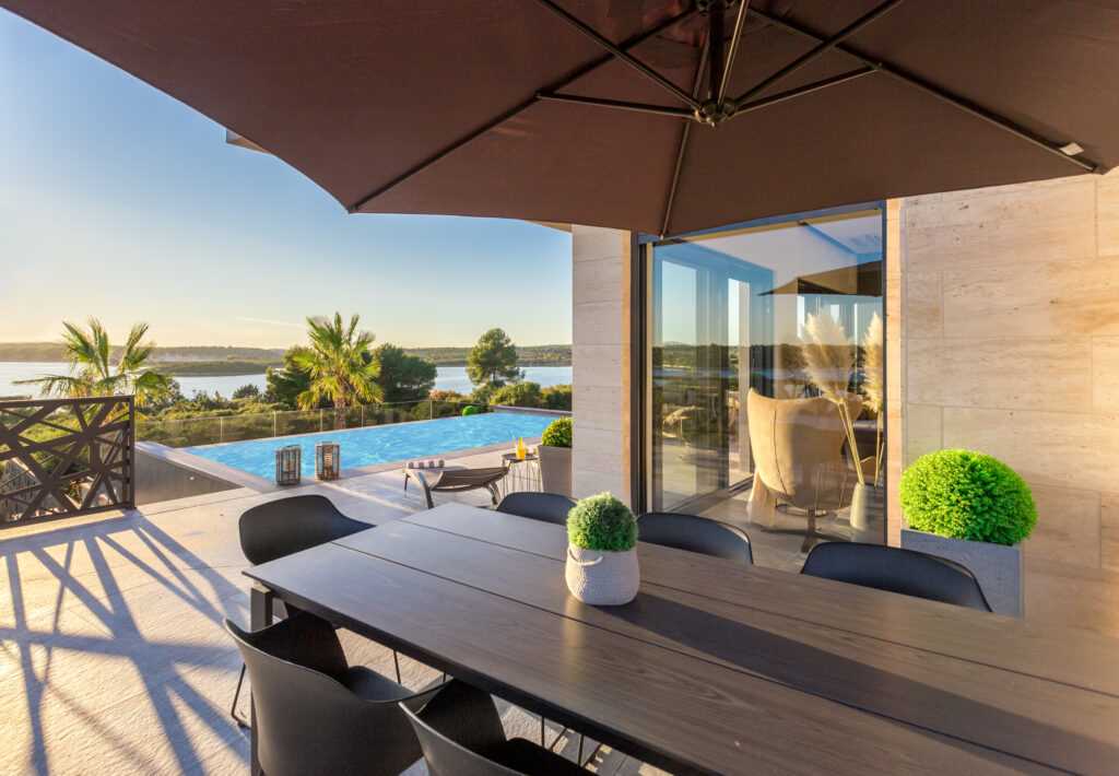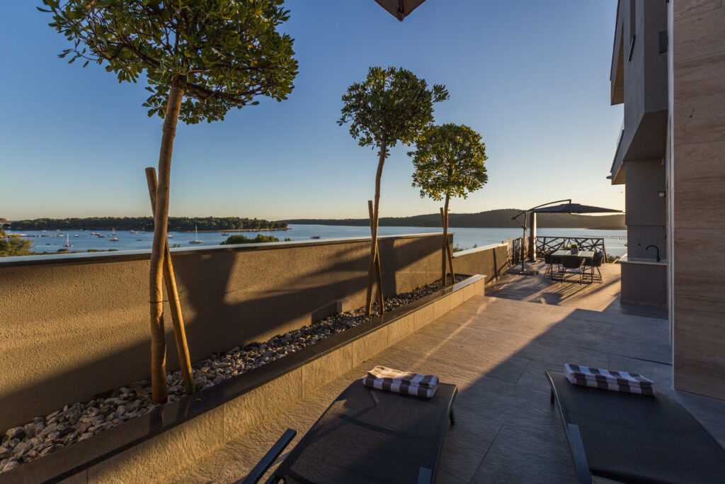 Terrace & Pool The spacious terrace overlooks the Vižula peninsula and Medulin bay. Guests can relax on deck chairs, cool off in the infinity pool, or use the outdoor shower. An outdoor dining area with a grill is perfect for evening gatherings, especially during stunning sunsets.