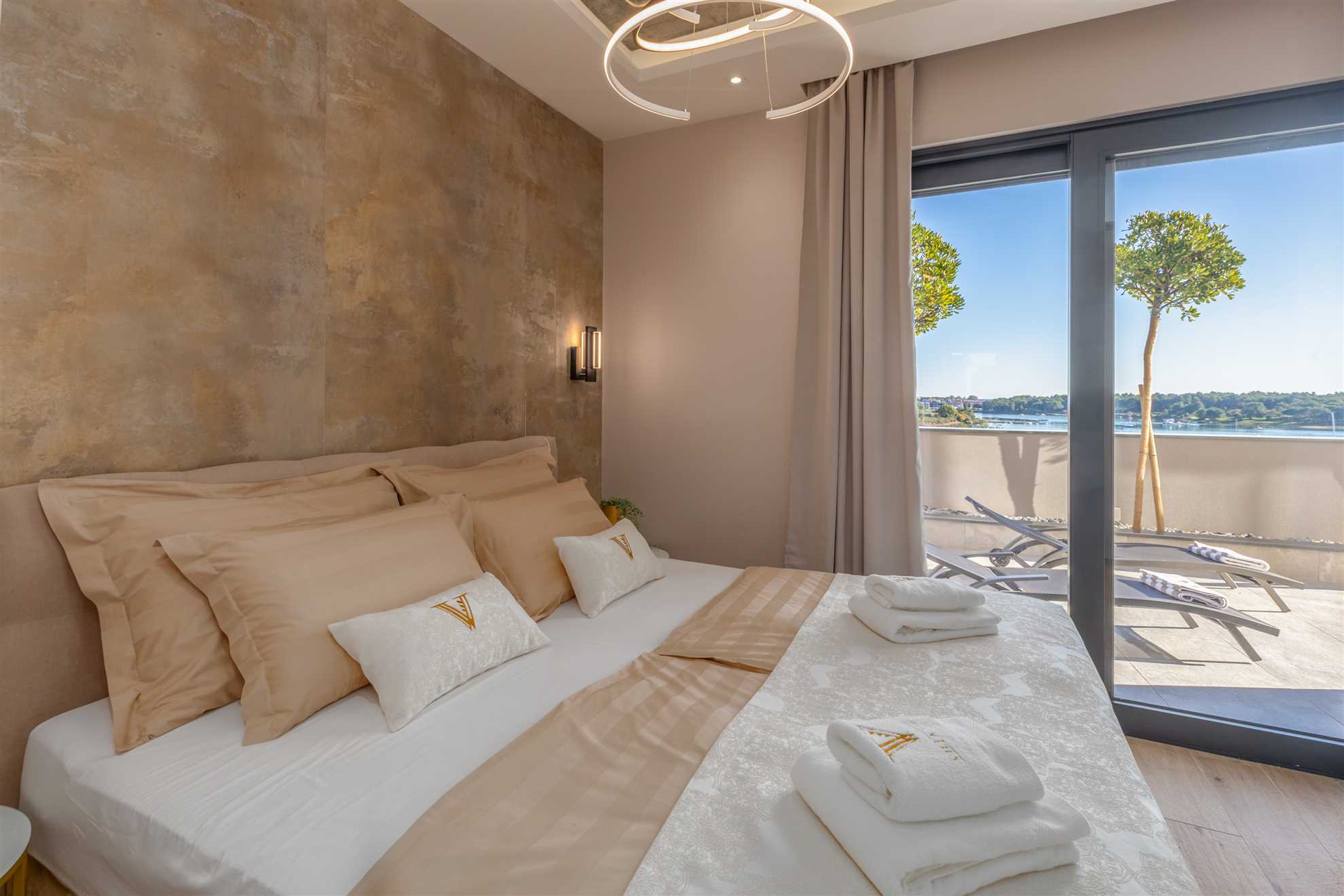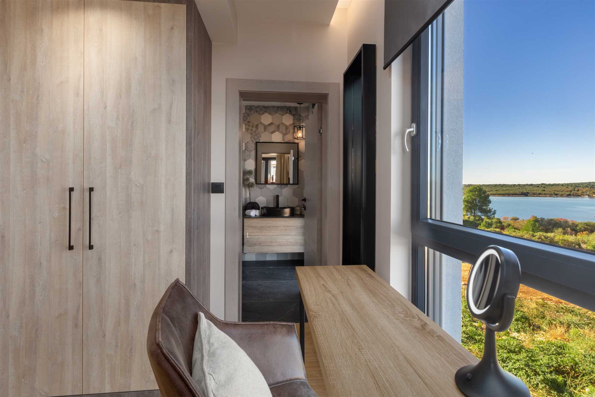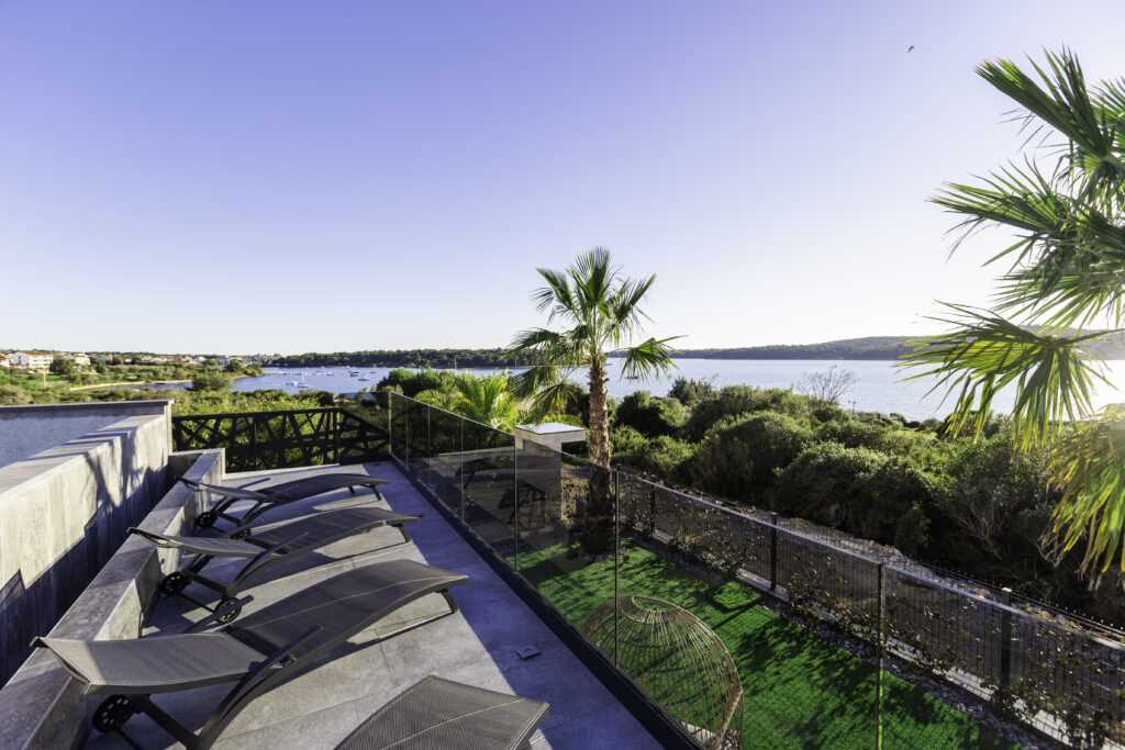 Terrace & Pool The spacious terrace overlooks the Vižula peninsula and Medulin bay. Guests can relax on deck chairs, cool off in the infinity pool, or use the outdoor shower. An outdoor dining area with a grill is perfect for evening gatherings, especially during stunning sunsets.