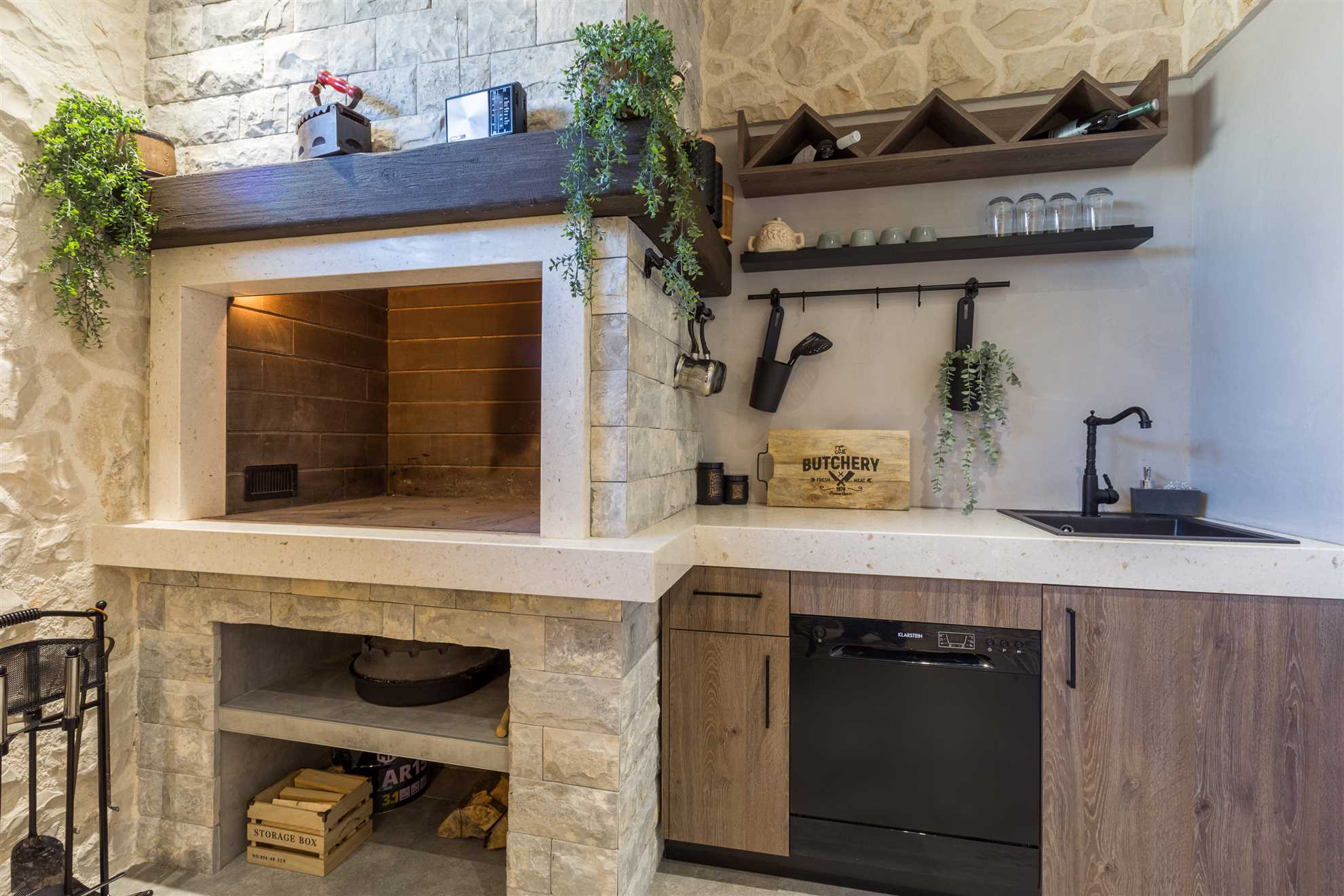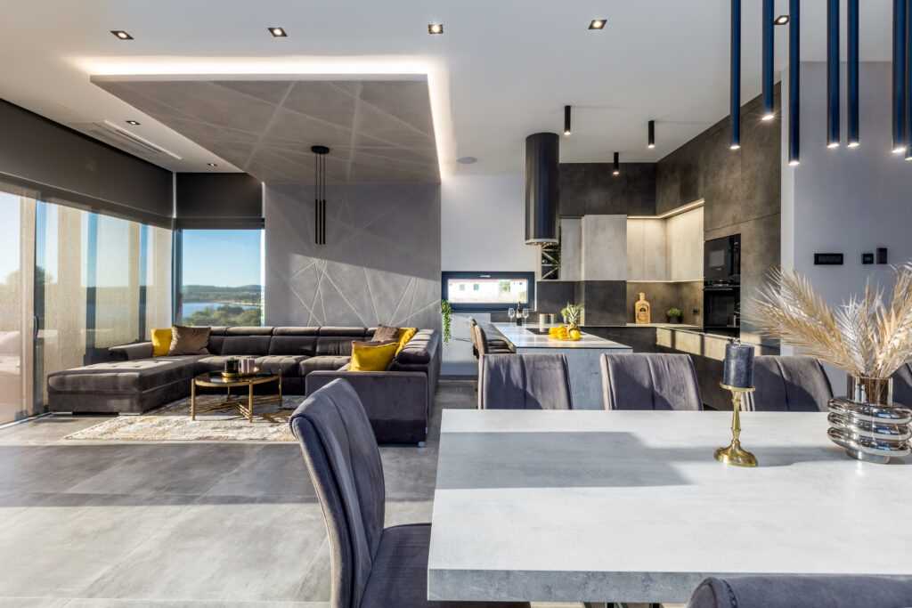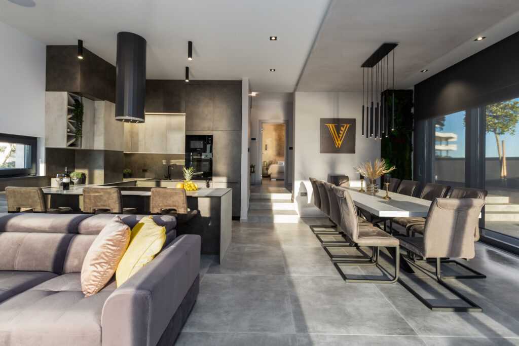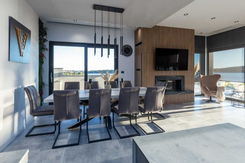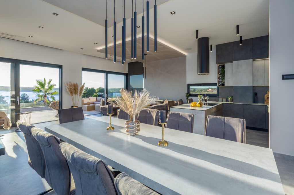 Spacious Living Area The ground floor features an elegant open space with a modern, fully equipped kitchen, a dining area for 10 people, and a cozy living room with a wood-burning fireplace. Floor-to-ceiling glass windows open to the terrace and sun deck. Guests can hire a personal chef or enjoy fresh farm produce delivered to the villa.